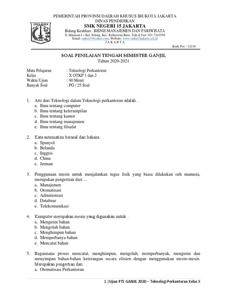 Kelas xi otomatisasi dan tata kelola perkantoran poin pembahasan 1. Jadi dari 50 soal tersebut ada soal materi kelas 10, soal adminsitrasi keuangan kelas 11 dan kelas 12. Soal dan kunci jawaban administrasi umum kelas 10 semester 2 kj bk bismen c1 smk x sri endang. Berikut ini merupakan contoh aplikasi otomatisasi perkantoran kecuali. 23/01/2022 soal adm perkantoran kelas xi smk.